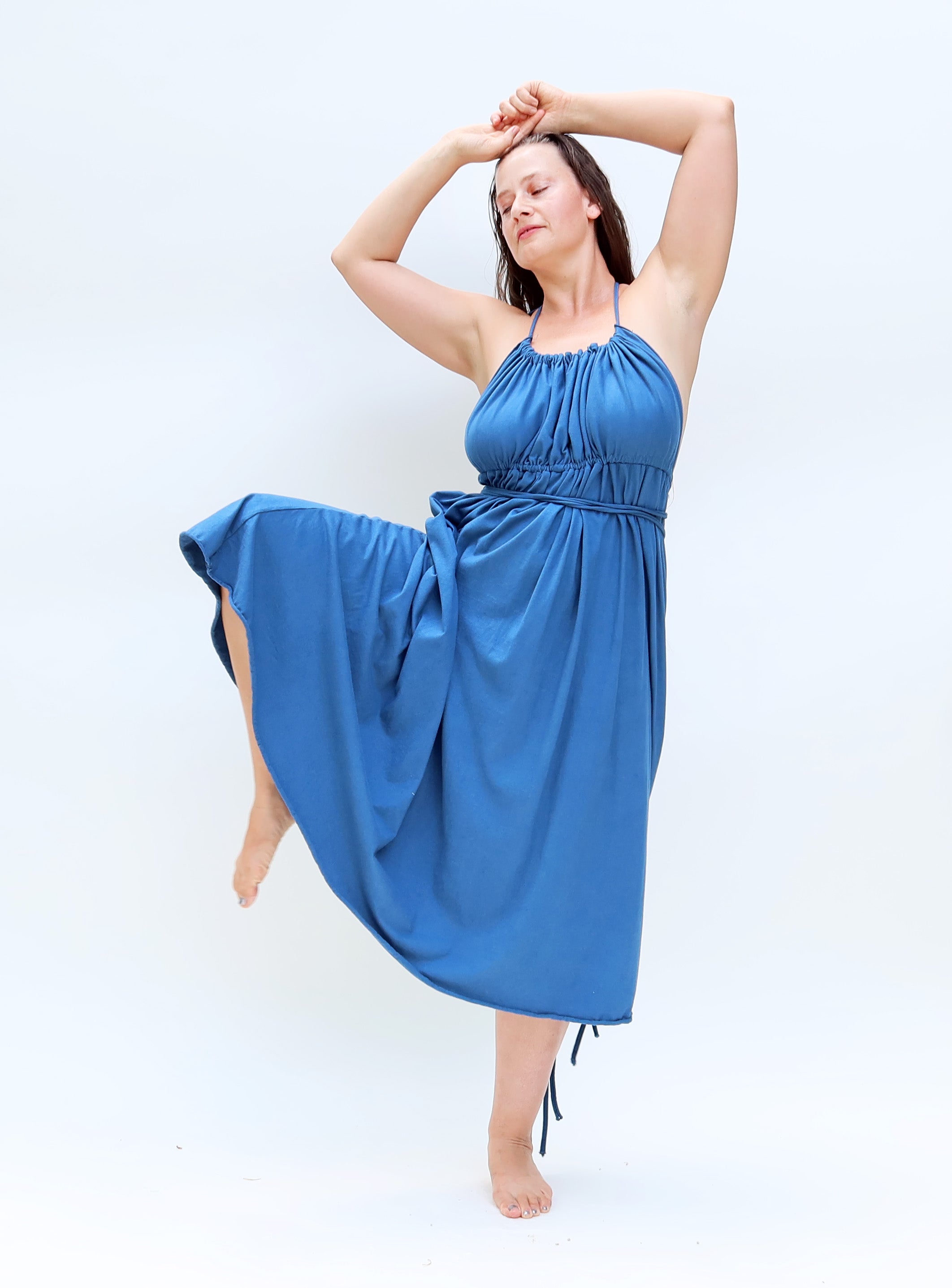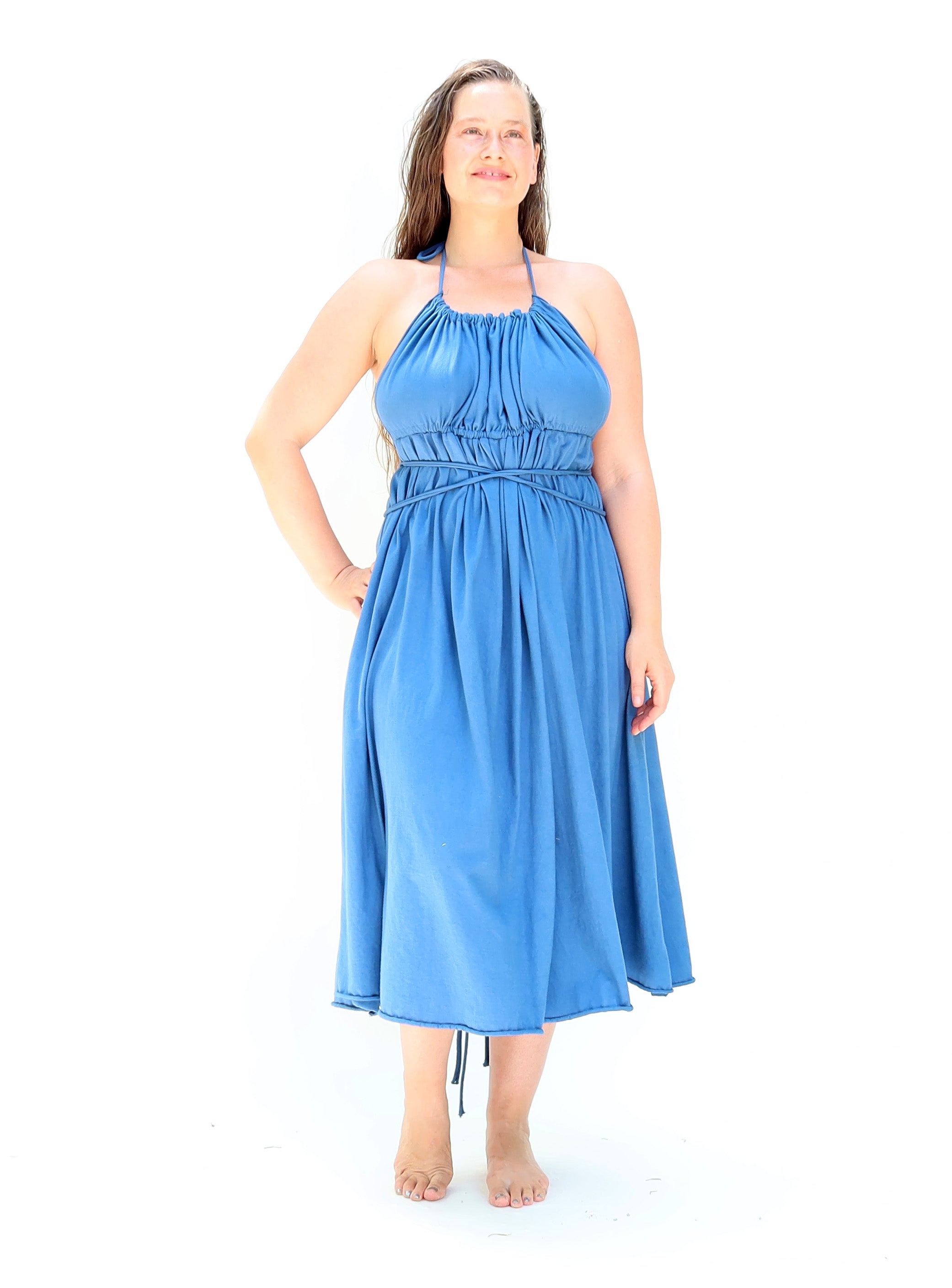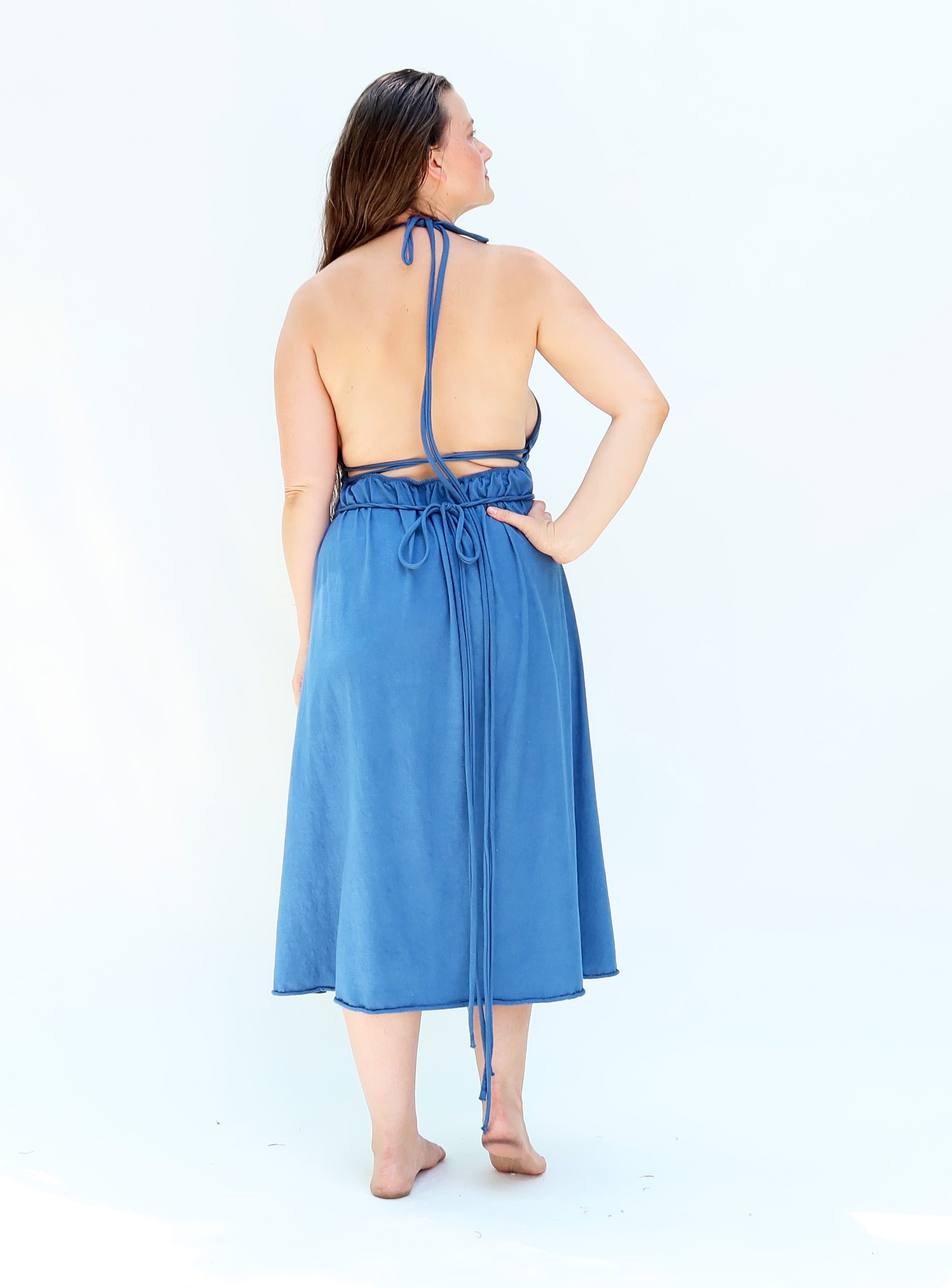 The Demeter dress is a backless design with a gathered bust in front. Gathering ties can adjusted and wrapped around the body to create different looks. Sensuality and sustainability combine in a dress designed for the romanic heart.