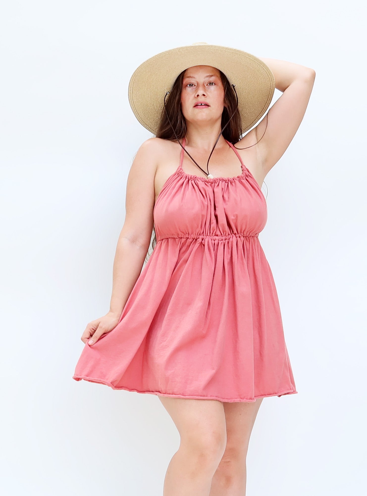 The Demeter dress is a backless design with a gathered bust in front. Gathering ties can adjusted and wrapped around the body to create different looks. Sensuality and sustainability combine in a dress designed for the romanic heart.
