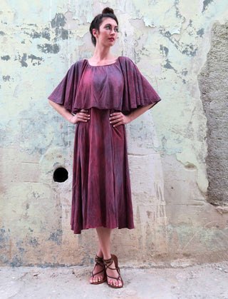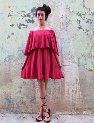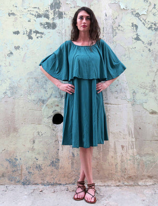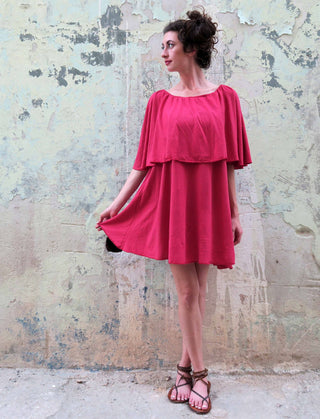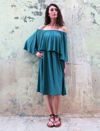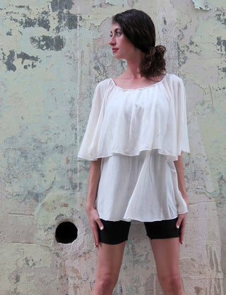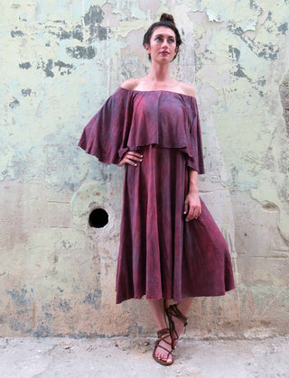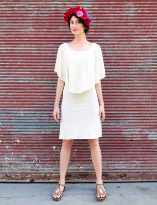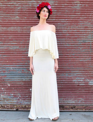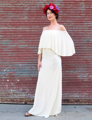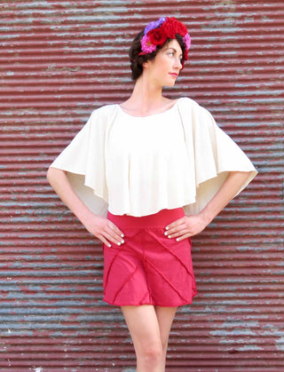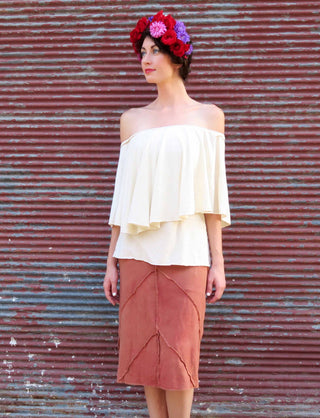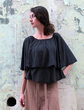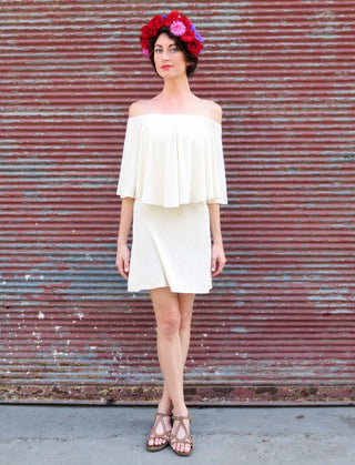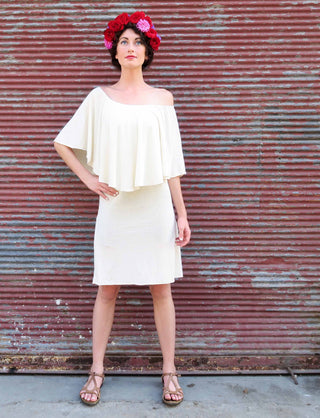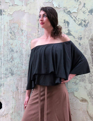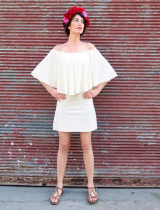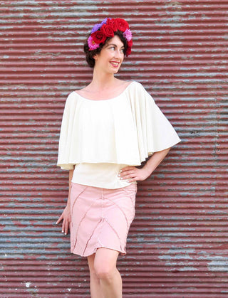 The Frida design is a romantic and flouncy circle overlay with an elasticized neckline. Neckline can be worn over the shoulders for a scoop neck or pulled down for an off the shoulder silhouette.