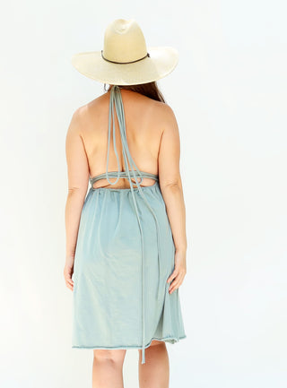 The Demeter dress is a backless design with a gathered bust in front. Gathering ties can adjusted and wrapped around the body to create different looks. Sensuality and sustainability combine in a dress designed for the romanic heart.