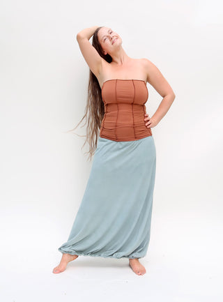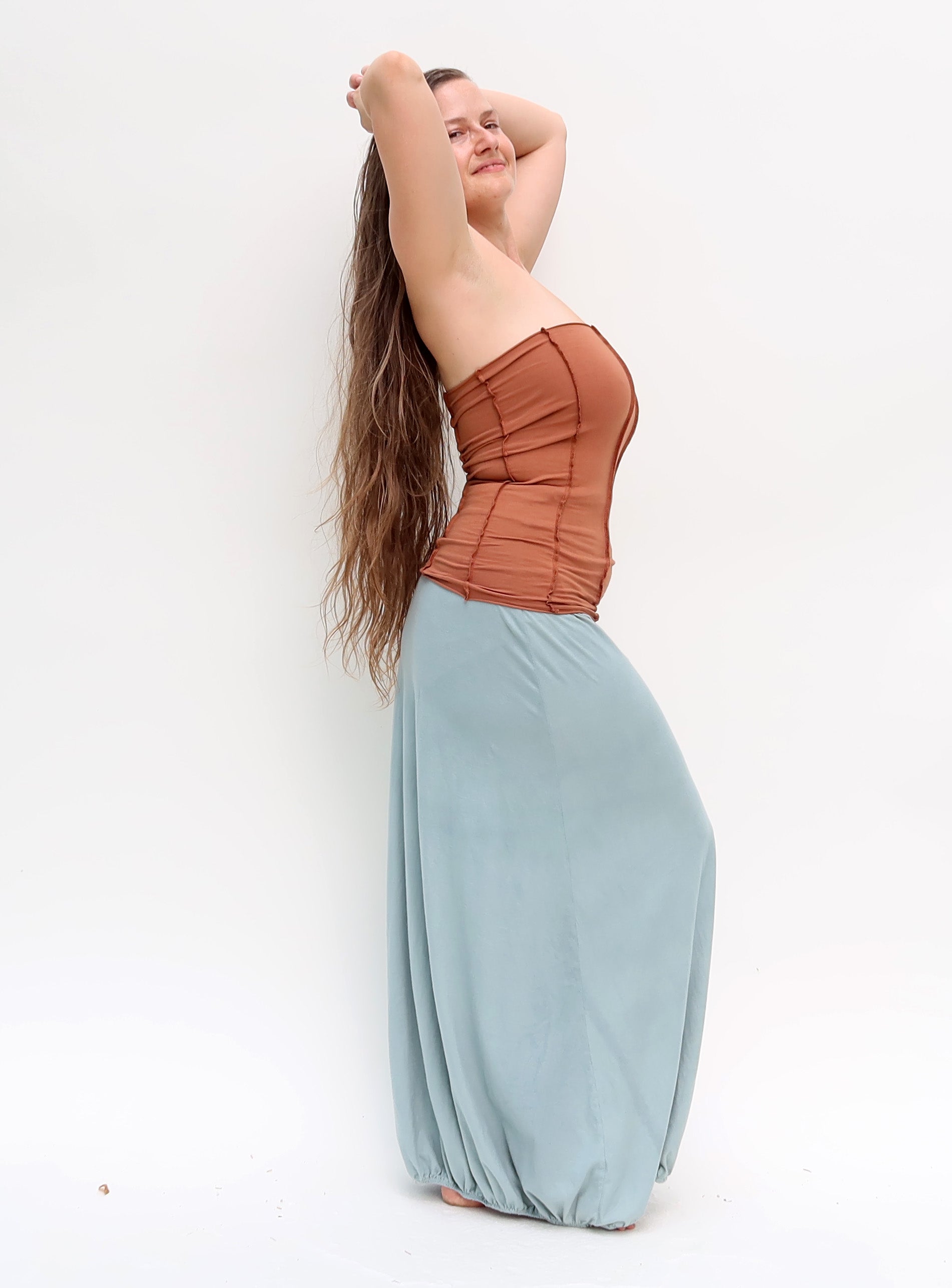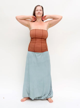 Style - The Corset Tube Top is a torso-length tube of stretchy fabric. Vertical lines are added to create corset inspired detailing. The edges are left raw for a textured look, and the seams are reinforced for durability and support.