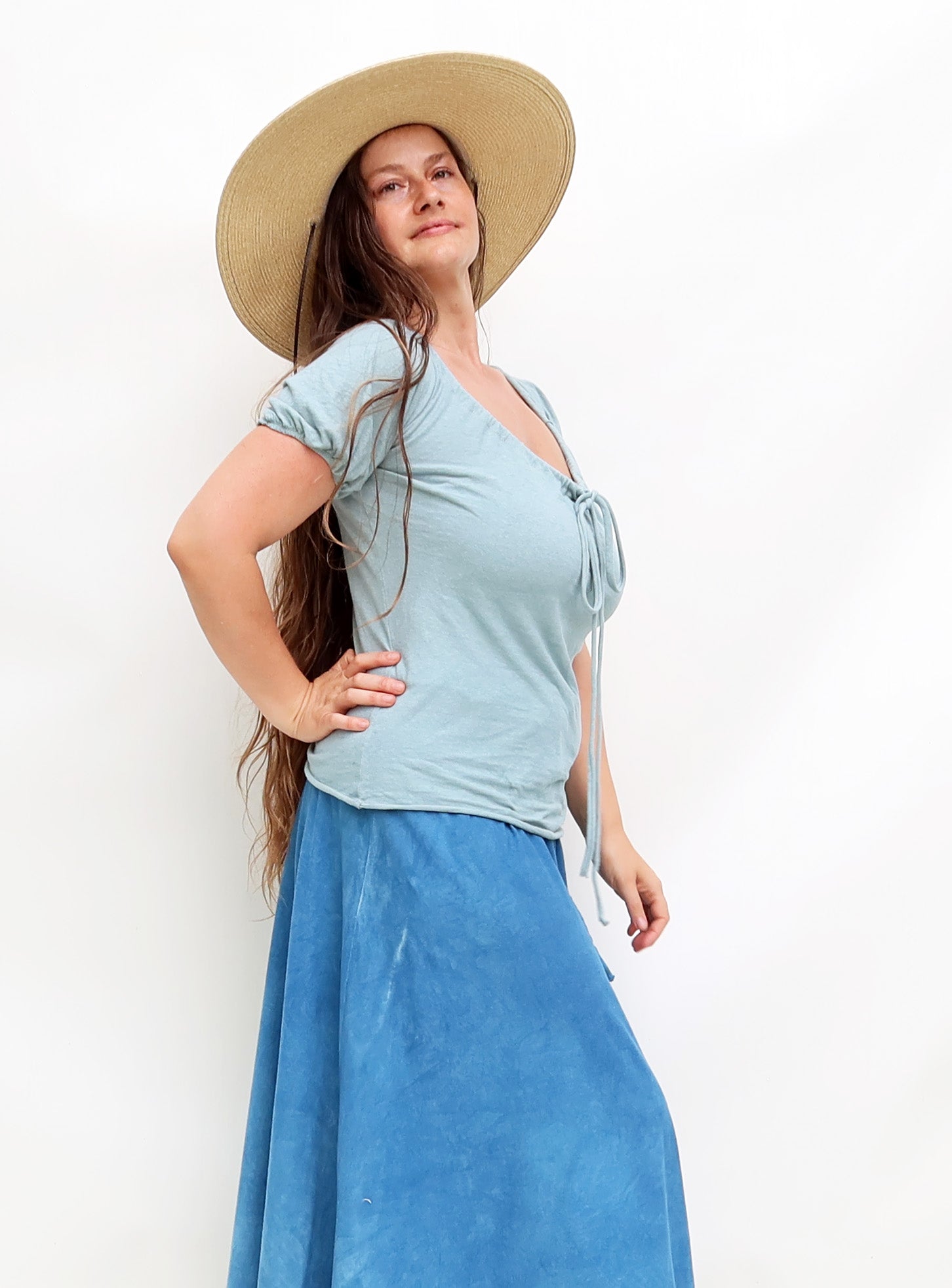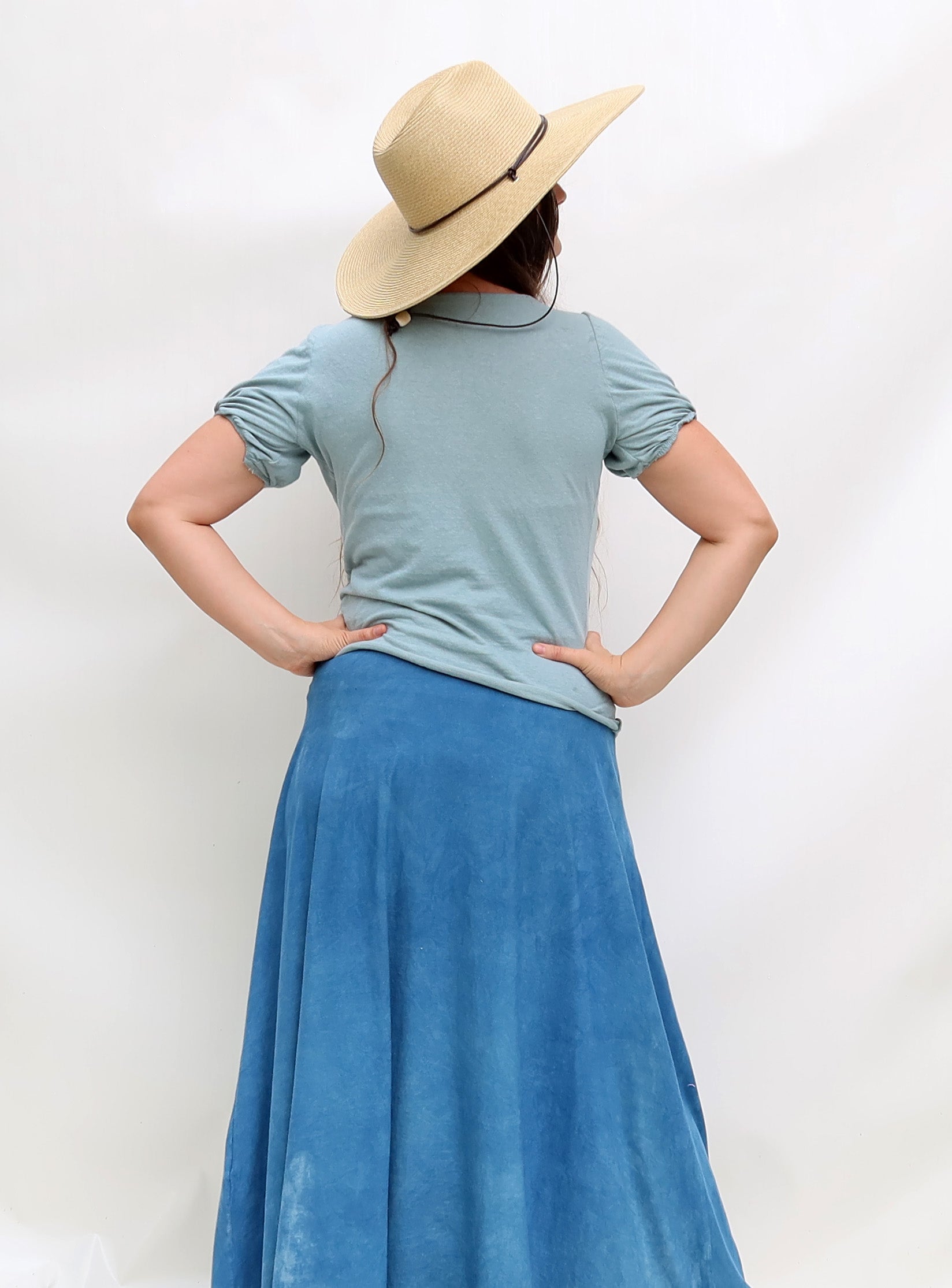 Each garment is made-to-order and ships in 3-4 weeks! We hand cut, sew, and dye all garments at our studio in Greensboro North Carolina based on your unique choices. We are a small team of artisans who are paid premium wages and work in a beautiful and peaceful studio space. Your purchase with us is a commitment to support transparency, sustainability, and a healthy work environment for the artist that make your clothing!!