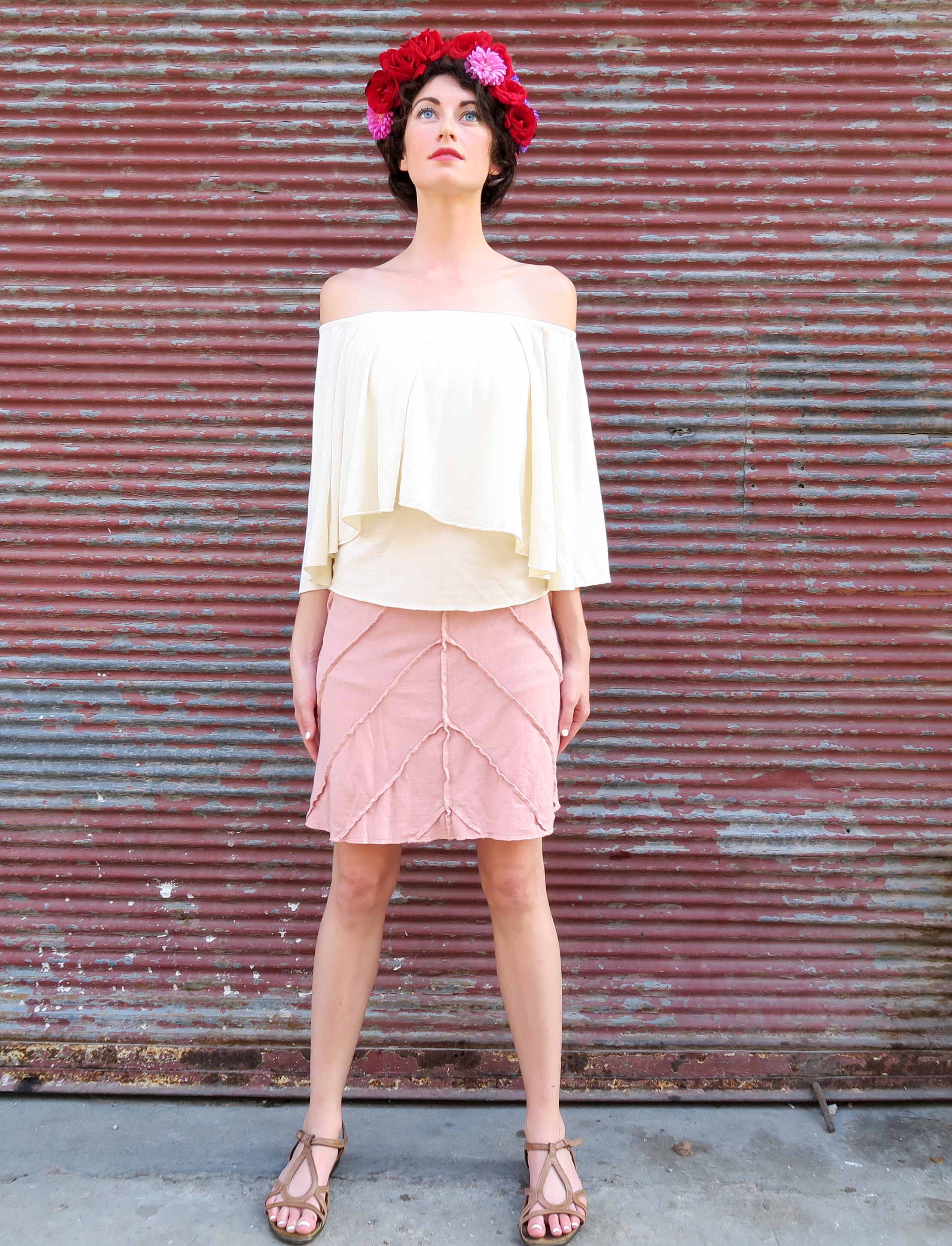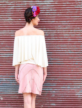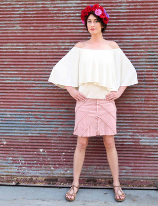 Style – The Frida design is a romantic and flouncy circle overlay with an elasticized neckline. Neckline can be worn over the shoulders for a scoop neck or pulled down for an off the shoulder silhouette.