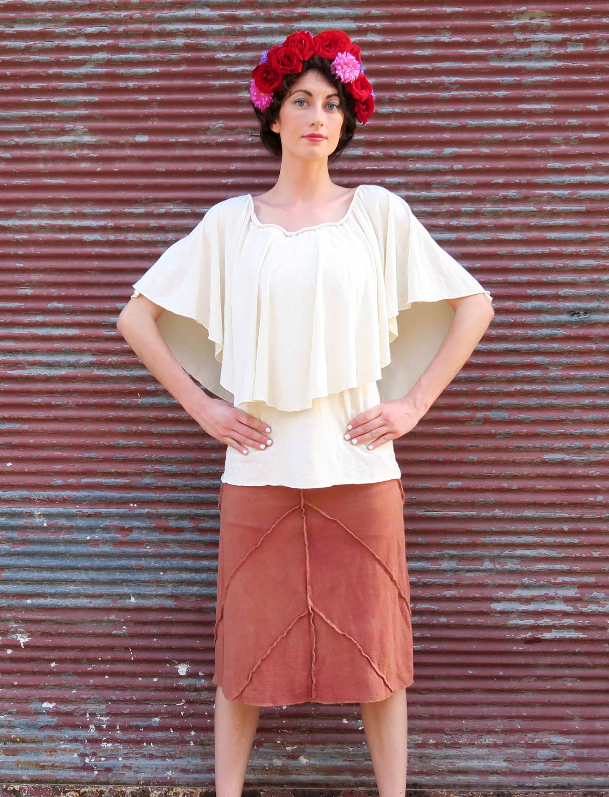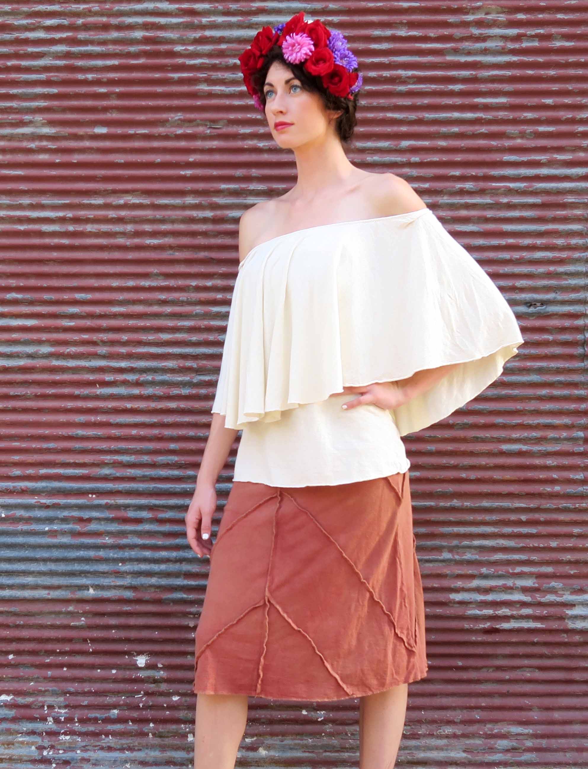 Style – The Frida design is a romantic and flouncy circle overlay with an elasticized neckline. Neckline can be worn over the shoulders for a scoop neck or pulled down for an off the shoulder silhouette.