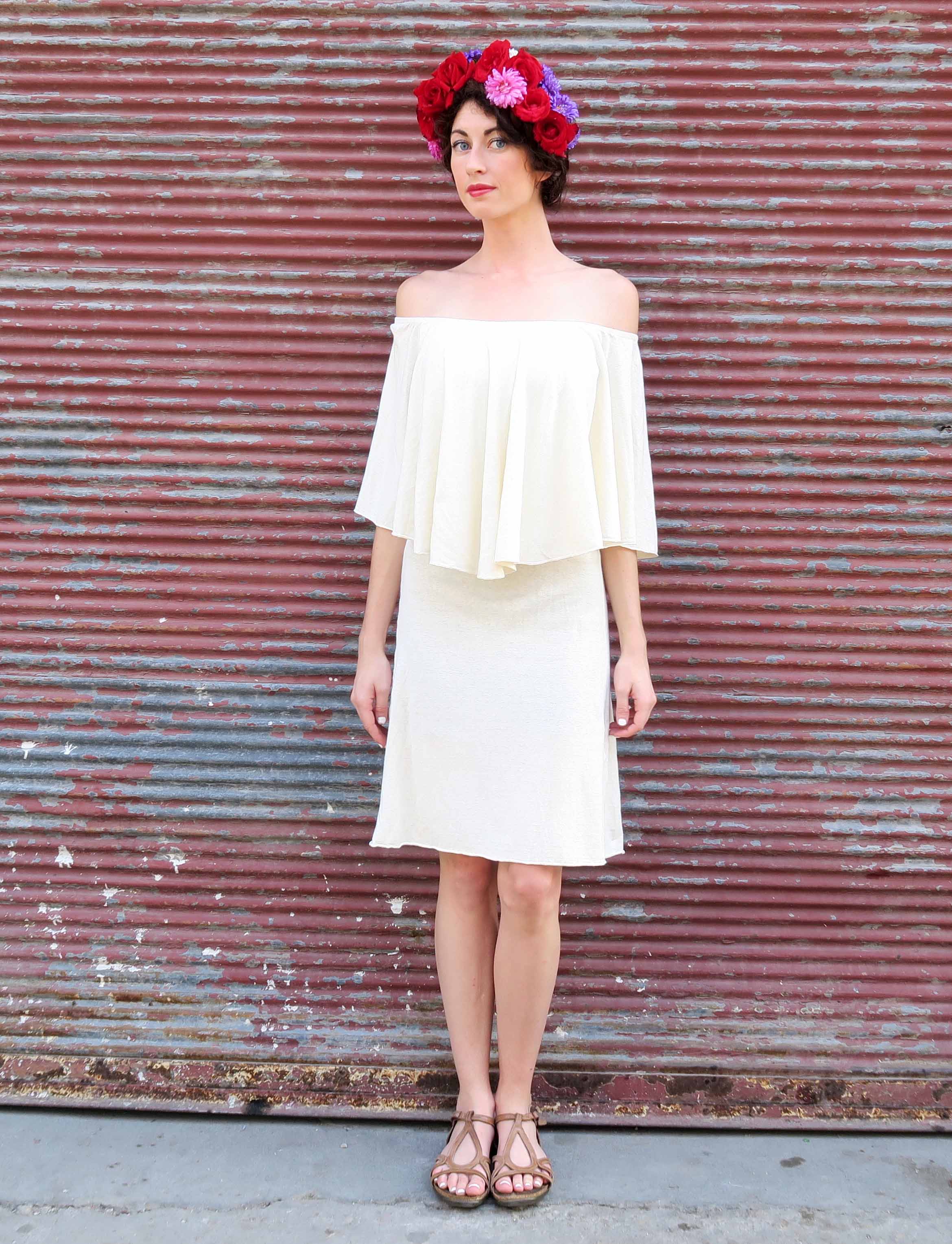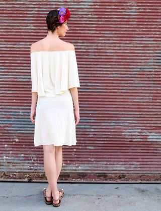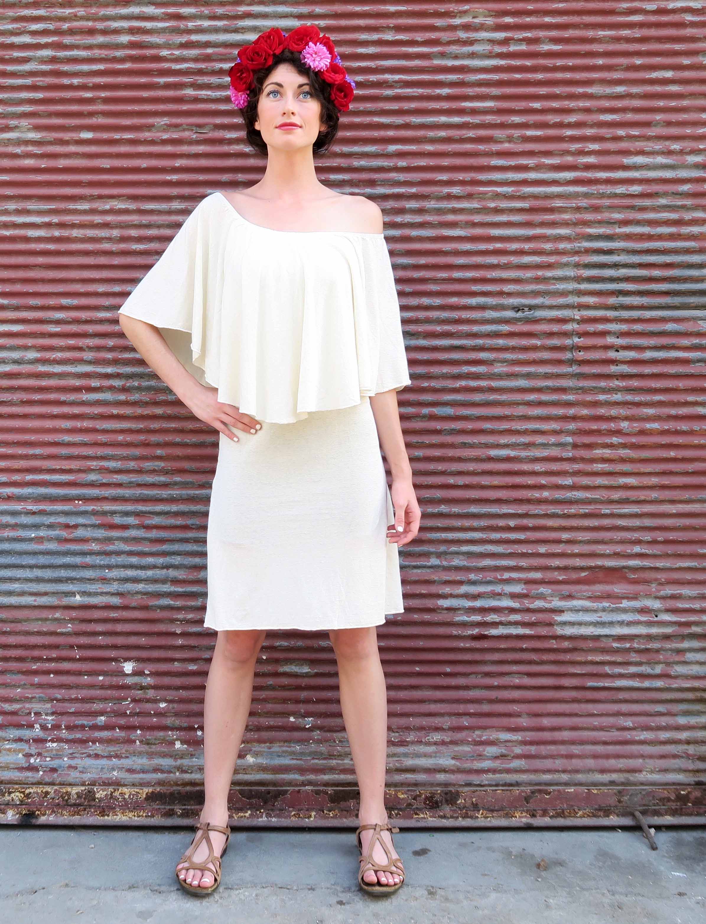 Style – The Frida design is a romantic and flouncy circle overlay with an elasticized neckline. Neckline can be worn over the shoulders for a scoop neck or pulled down for an off the shoulder silhouette.